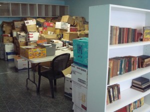 Behind the wall of shelving (and the facade of organization!) is our sorting area. This is where the real work is done, sorting through donations and assigning them a new home.
