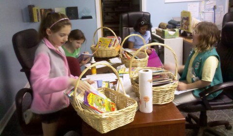 Over the past several weeks, Girl Scout Troop #969 has been hard at work cleaning, repairing, and stamping over 1,000 children’s books which will be distributed via book baskets. Ultimately, these baskets will be delivered by the troop members to a variety of locations where children often wait – hair salons, karate studios, car repair shops, and more. The books will offer children a positive opportunity to read during moments that might simply be wasted.