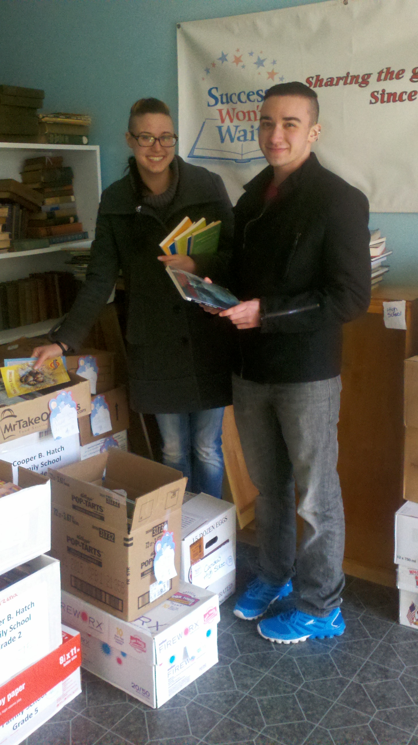 But, Christine can’t do it alone! So, she has enlisted the help of several Success Won’t Wait volunteers to help her reach her goal! This week, Von Scully and Christine’s older sister Ashley Rose McNeill made a huge dent in the existing collection at the Success Won’t Wait office, sorting and organizing donated books into appropriate grade levels.