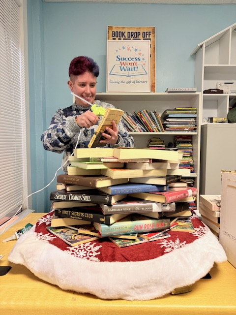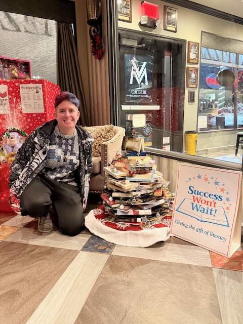 To promote the partnership, V&M’s Hilary Newman (pictured) created a beautiful Christmas “tree” made of – you guessed it – books from Success Won’t Wait’s collection! The tree will be displayed in the V&M lobby throughout the holiday season. All books collected through this book drive will be used for Success Won’t Wait’s ongoing partnership with the nearby Claymont Community Center.